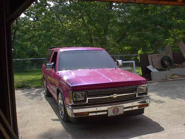 Pepto Bismol pink (NO I'M NOT GAY) with a blue pearl 93 chrome grill w/billet insert, a shaved roof rack, & emblems COMPLETE SHAVE COMING SOON DID I MENTION THIS IS UNDER RECONSTRUCTION
