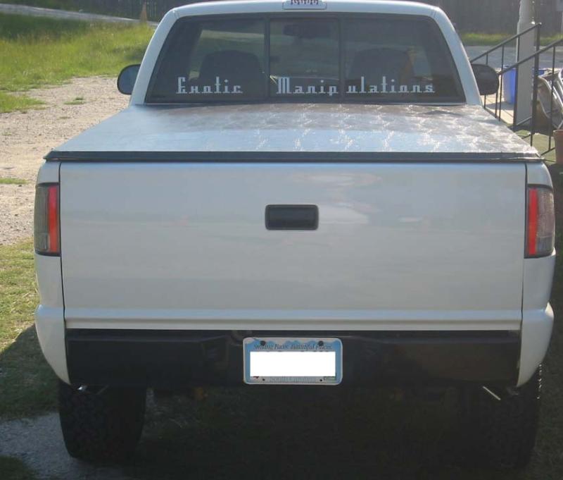 BMW style projector headlights, euro wipers, Exotic decal, blacked out windows, toneau cover, blue powder coat calipers, clear corners, clear brake lights, flame 3rd brake light cover, white APC washer lights, white underbody neons, shaved emblems, BedRug bed carpet, Street Scene custom grill, Street Scene front valance, billet chevy bowtie, rollpan with hidden hitch and flip up license plate
