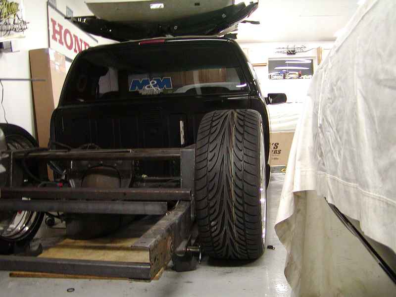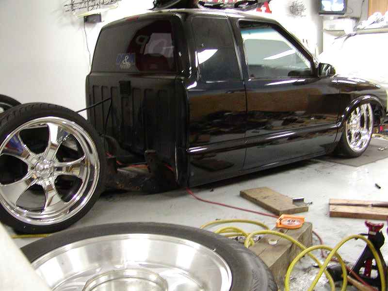 SuicideDoors 8" bridge and 3-link w/ raised gastank crossmember, AirRide upper and lower arms, Engine Driven compressor, 2600s all around, 2-7 gallon tanks(under bed), 3/8" Parker Valves w/ 5/8" orfice, 1/2" line.