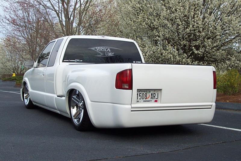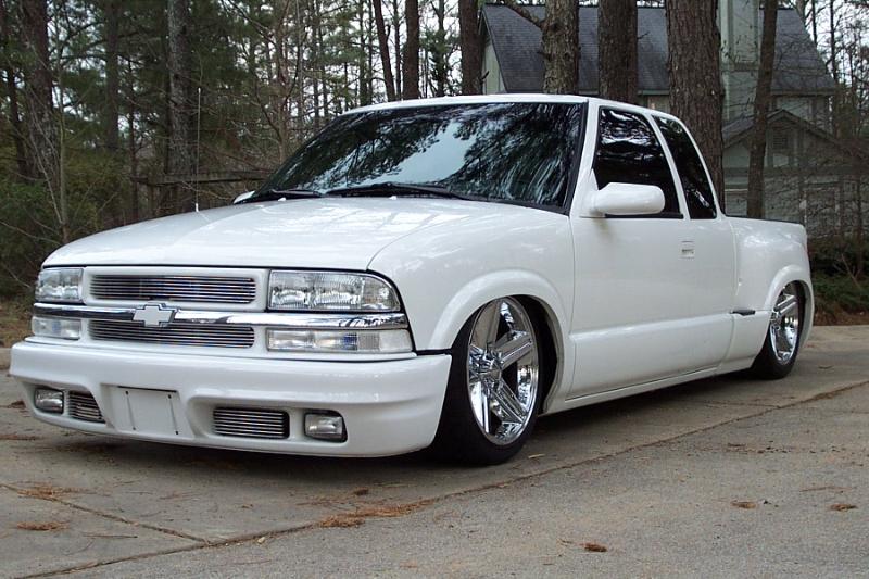 tweed and ostrich interior, new sub box, shave and mold front of bed, bravada front bumper, shaved antena- 3rd break light- hood pissers, SD.com front kit, an SD.com 5 link, budnik wheels