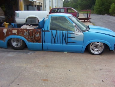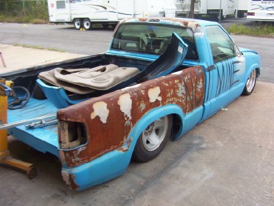 shaved doors, wiper on ps, roll pan, hightec leds, smoothed bed inside and raised floor, smoothed back of cab and front of bed wall. cowl hood, 2000 sonoma front end. shved mirrors, tail is shaved but functional to access valves. bed floor has acces doors for fuel and battery.