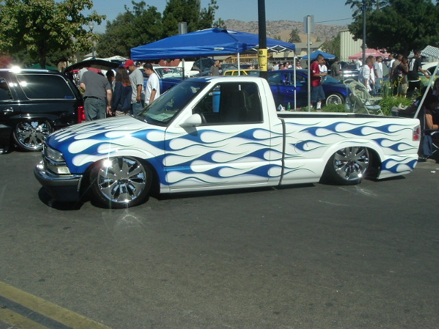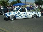 Shaved Doors, Tailgate, Squirts, Antenna, Molded Roll Pan, Flames Done by K-Daddy Kustomz in Bakersfield, True Blue W/ Limetime Pinstriping and Burple Airbrushing, APC Clears, PIAA Hyperwhite Bulbs, Toucan Tailights, Trenz Billet Wiper Covers, Trenz Billet Grill