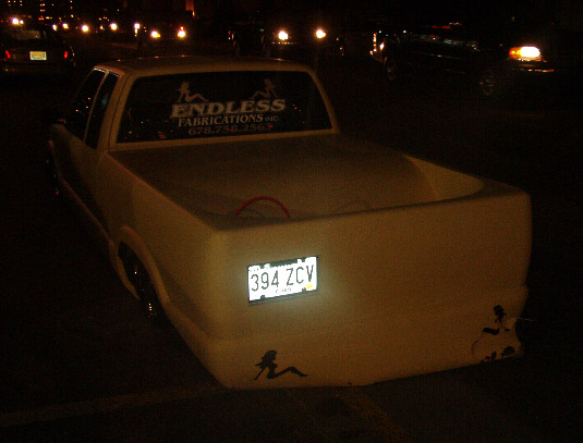Bodydrop, cali-Combo w/ frenched plate, door handles, third brakelight, taillights, and antenna shaved, custom built LED trucker girl taillights(fabricated by SuperD), chrome motorcycle pop-up gas door, 2" cowl hood, 98 S10 chrome bumper/black lower valence, sheetmetal bed w/ radiused rear corners, full beige primer, all done by Endless Fabrications Inc. in Dallas, Georgia--(678)-758-2563