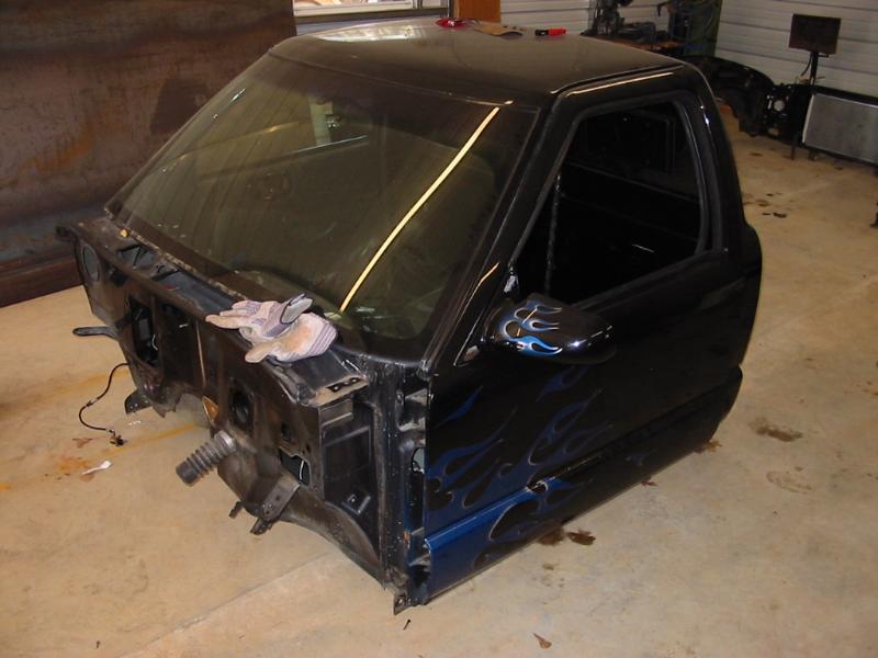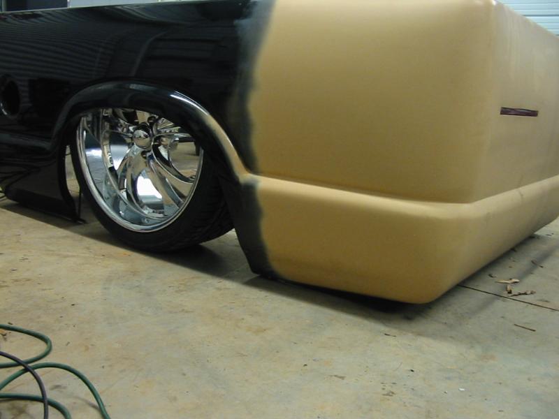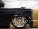 Shaved doors,antenna, hood pissers, full skin in back w/ 2 14" LED lights. Painted black w/ corvette blue flames and silver highlights.Shaved gas door and 3rd brake light