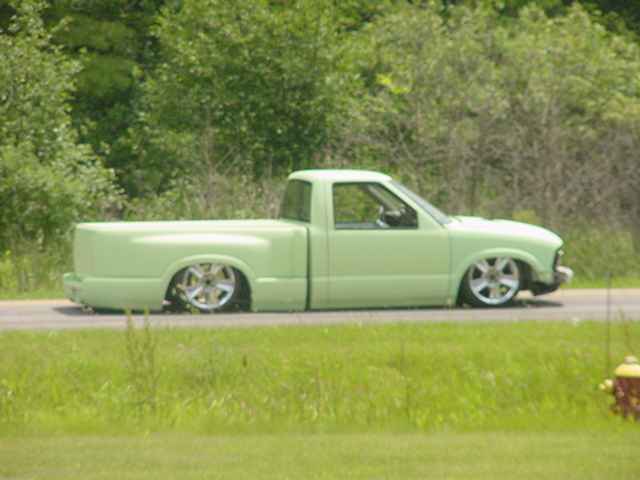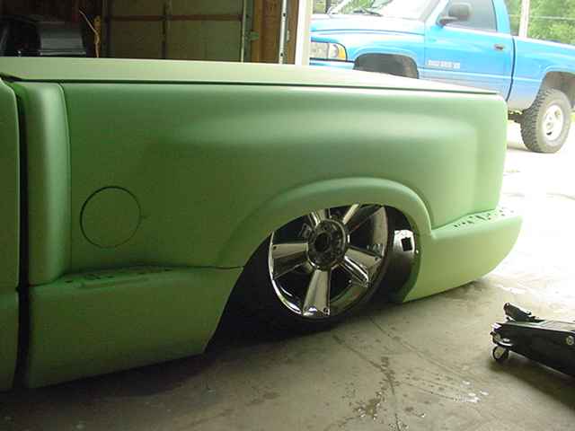 Shaved door handles, shaved mirrors, shaved 3rd brake light, shave taillights, shaved tailgate handle, shaved antenna, god rid of the step shaver kit, and am puttin the stock stepsides back on, i seem to like the look of them better, espically when there squashed on the ground. Finished the inside of the bed, sprayed a Rhino bed liner on it, hooked everything up and plumbed the juice, everything works niceley. Haveing battery problems tho, hopefully will be fixed soon. Waiting on sonoma front end parts, then it will hit the streets.