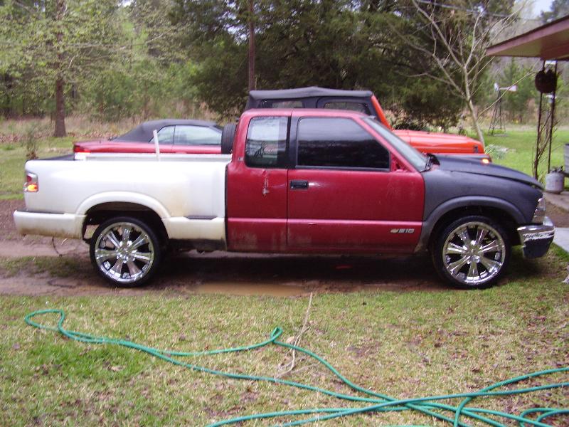 factory with hood scoop, a 1998 s-10 front clip and stepside bed.