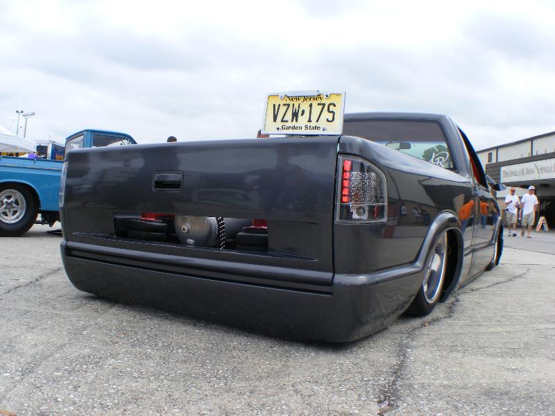 Shaved, and sprayed Dodge Dakota RT Gun Metal Grey. Tailgate has been cut and shaped to show the rear bag setup through the gate(done over 2 years ago) Bed is smothed out and houses the Seriously Insane Full cell and to Viairs