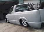 4.3 V6 Vortec TBI (now blown up). Shaved heads, bored over 30thousandths, ported and polished, with larger injectors. 8.5mm Plug wires, Boss Platnuim 4 Prong Plugs. Electric fan. 2 1/2inch exhaust pipe ran to a 3Aracing dual outlet polished muffler. Automatic transmission rebuilt with stall and shift kit. Painted acc. Aegean Blue and Pure White. Had to remove heat, air condition, ABS system, wiper motor, cruise control, belt driven fan, and rerun all wires for the body drop to snugly tuck the 20''s in the front. 4.3''s are fun. Droppin in a fully built 350 LT1 (or LS1)Corvette engine, equipped with twin turbo. And a full corvette driveline with disc brake rear end.