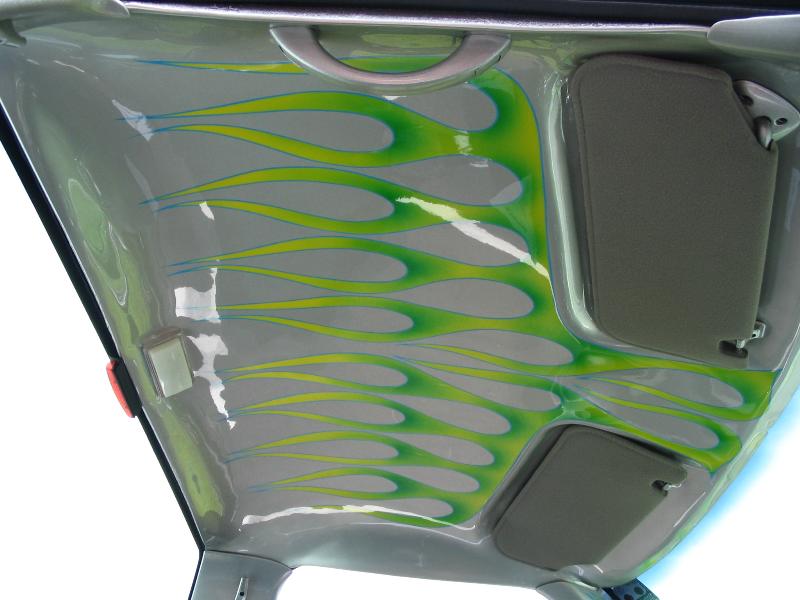 Smoothed and Painted Plastics With Some Murals, Custom Center Console and Shifter, FiberGlassed HeadLiner, Trenz RearView, and Colorado Customs Steering Wheel.