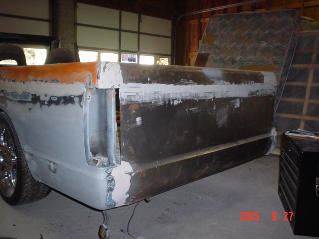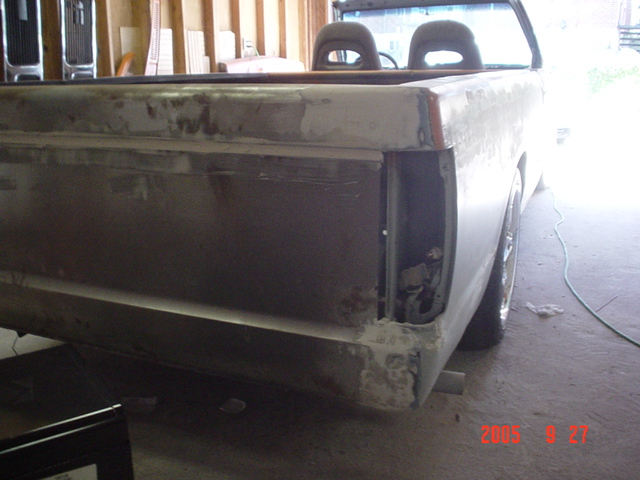 primer orange n grey 2 tone, shaved door handles, big wheels, headlight relocator, 1 piece gmc grill, no roof used to be a hinge kit, but now no longer (roof is somewhere in the dump).. shaved squirters, emblems, sidemolding, bed rail holes, antenna, full skin combo(in the works)