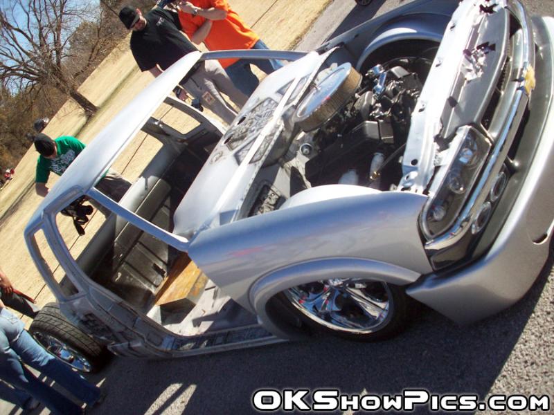 Sheetmetal bumper, s10/noma grille, tilt hood, stretched hood and fenders to windshield, grand prix doorhandles, tilt bed, sheetmetal bedfloor, Grant Kustoms skin, flushmount LEDs, shaved hood squirters, firewall,mirrors, 3rd brakelight, gas door, tailights, cab seams. Andromina silver with airbrush graphics by Jesse Marrow.