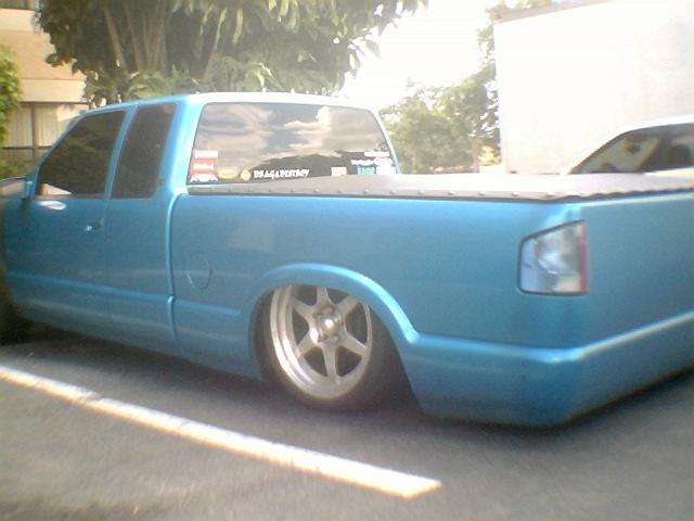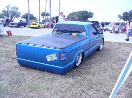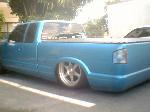 Stock Chevy Bahama blue, color matched door handles, frenched tag box, full skin combo, shaved: antenna,tailgate handle, hood pissers, gas door, 3rd brake light, 03 front end, billet grille, street scene bumper cover, ram air hood w/ 2" cowl, street scene cal vu mirrors