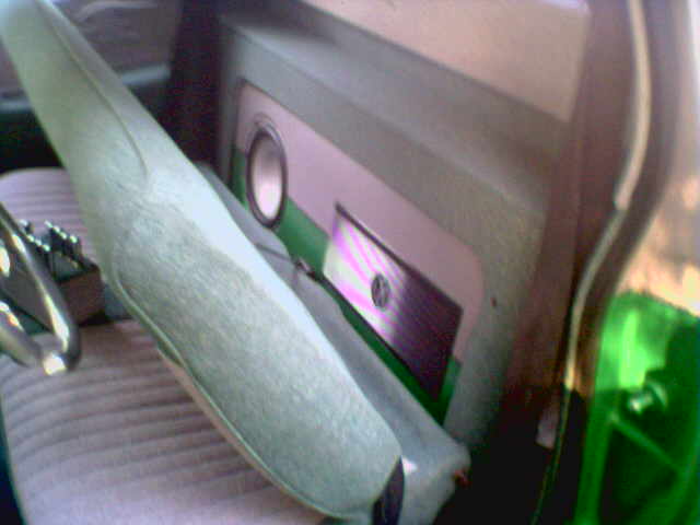 sold. Green & pewter tweed, door panels I made of fibre glass with speaker pods and tribal flames, tribal flames on dash, billet window cranks, billet steering wheel
