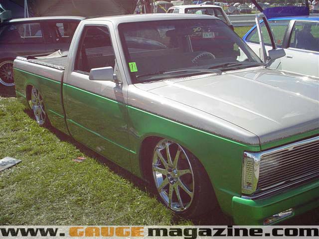 sold. shaved handles, antenna,emblems,tailgate, & front bumper, phantom grille, tailgate& rollpan molded to body, License plate box in center of tailgate skin, 3rd brake light above license plate, Honda del sol green & chrysler silver paint seporated by black tribal flames Clear corner & bumper lenses