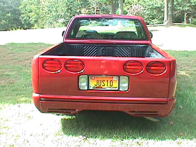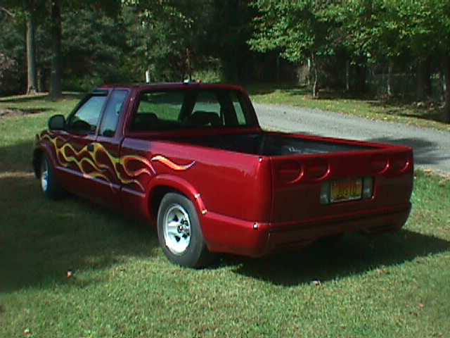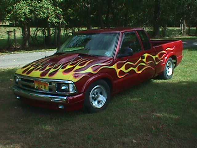 shaved taillights and emblems,corvette C-5 style rollpan and tailgate,clear corners,chrome antenna,flame paint done backyard style,painted wipers