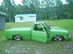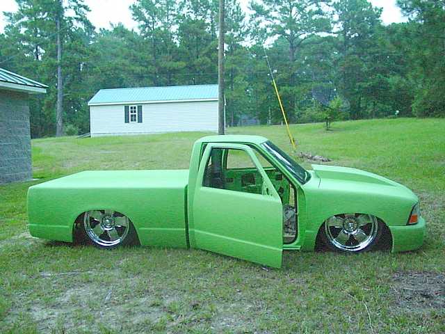FULLY shaved, Welded up bed, Grafted 2002 GMC Sonoma front end with hand built 4" cowl induction hood, Bodydropped 3.5", Suicide doors, 4" LED smoothed into tailgate skin.