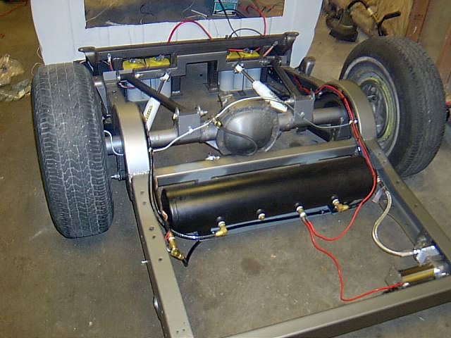 front&back. firestone air bags.five gallon air tank.1/2" lines,3/8 smc valves. two viair 380 compressors home built 4 link with 19" of lift in the rear and round notches.