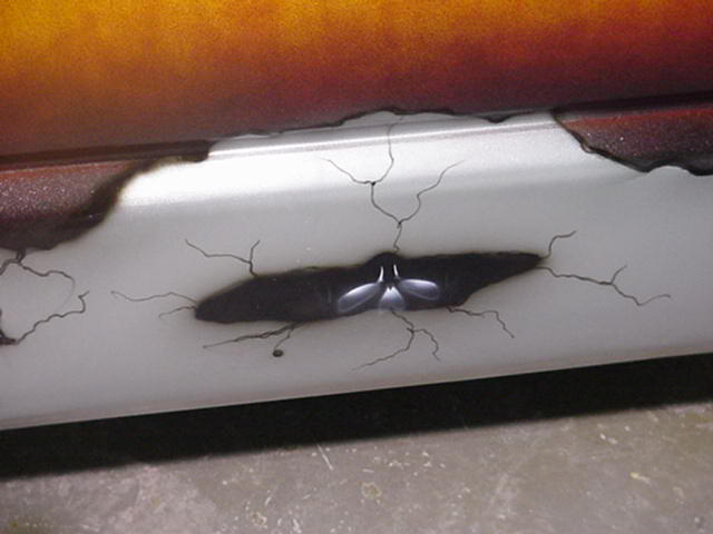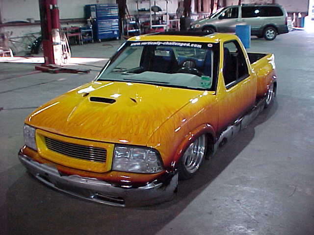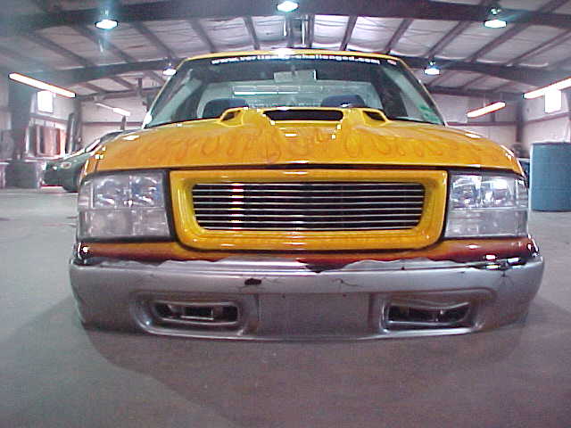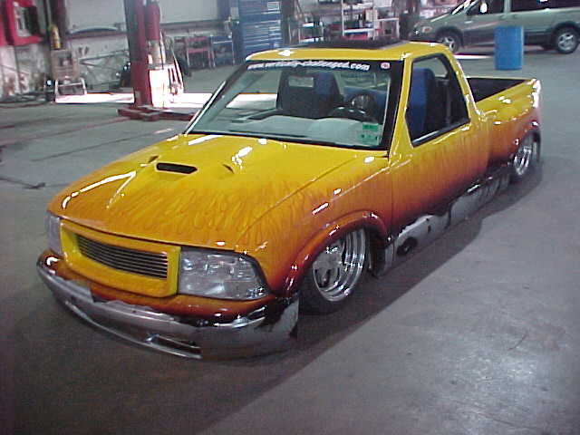 Shaved: door handles, tailgate, mirrors, squiters, gas door, wipers, antenna. 5 1/2 inch body drop to the doors , Yellow base , orange, red fire going up w/granite on bottum