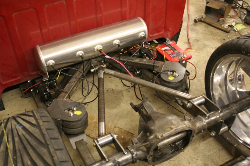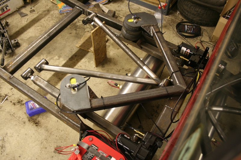 ART uppers and lowers, 2 inch drop spindles make up the front end. Wishbone 3-link in the rear, axle over frame design.
