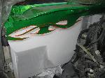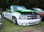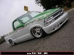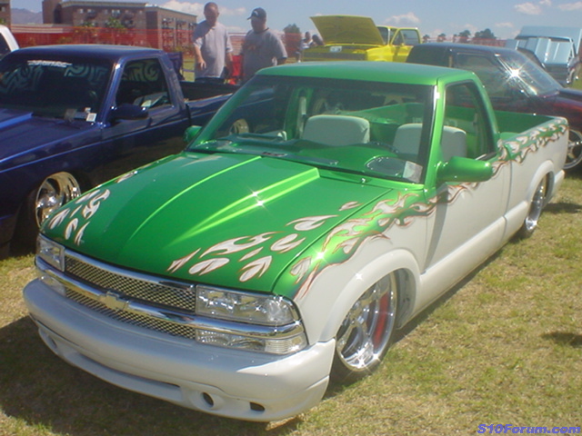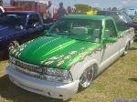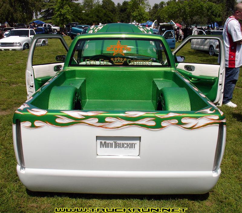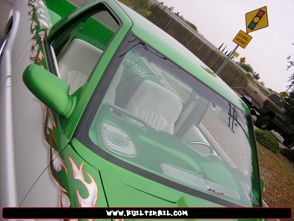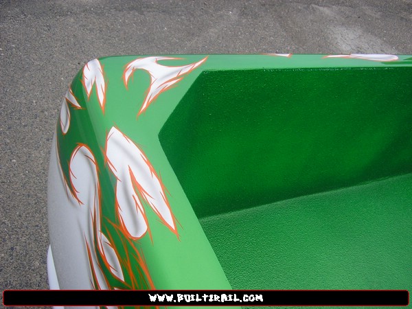 DUPONT HOT HUES PAINT (MIDORI SOUR GREEN OVER WHITE. WITH ORANGE PIN. FULLY SHAVED CAB. SHAVED ANTENNA SHAVED REAR END WITH KADEEZ. SHEET METAL BED WITH HOT HUES TINT IN THE LINE-X. FLUSH MOUNTED CHOPPER GAS CAP IN BED. CLEAR HEADLAMPS WITH CLEAR CORNERS. SS SPEED GRILL, SS MIRRORS, SS VALANCE. GOODMARK STEEL COWL HOOD.