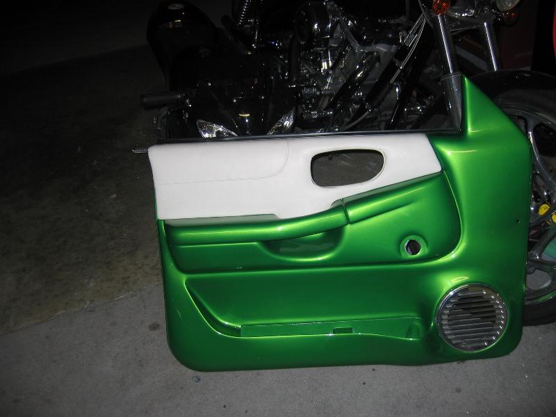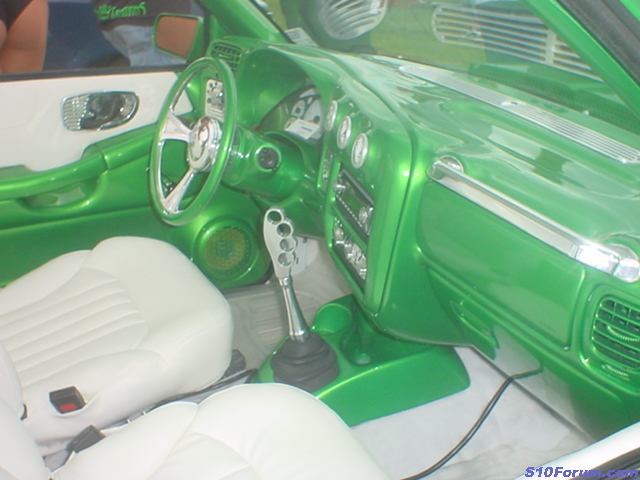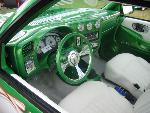 FULLY PAINTED DASH WITH MOLDED KP GUAGES. BILLET DOOR BEZALS, BILLET OH SH*T HANDLE, BILLET DASH VENT, BILLET SPEAKER GRILLS AND BILLET (BRASS KNUCKLE) SHIFTER. PAINTED DOOR PANELS AND DYNAMAT THROUGH OUT THE CAB. MORE BILLET PIECES TO COME. WHITE CARPET & KRIST KUSTOMS STREAMLINE STEATS TO BE WRAPPED IN WHITE LEATHER.