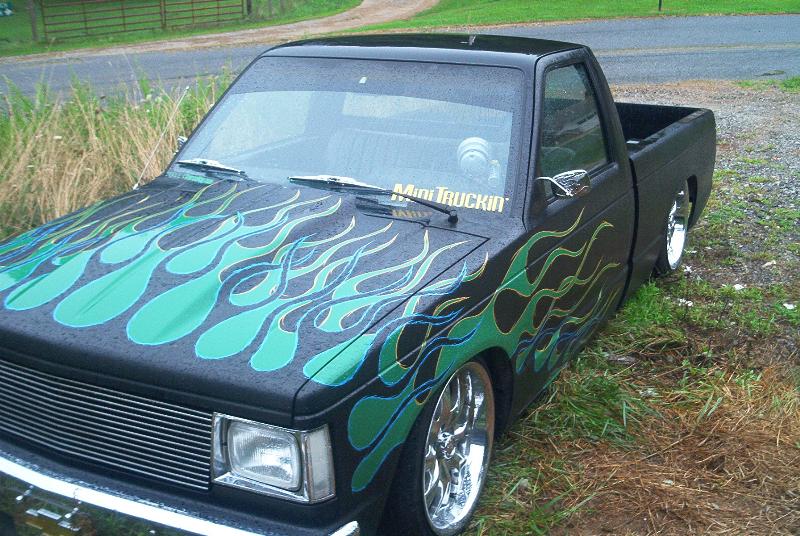 Satan Black With Green Flames With Blue and Yellow Pinstripes With Suicide Doors Completely Shaved... Motor Cycle Mirrors