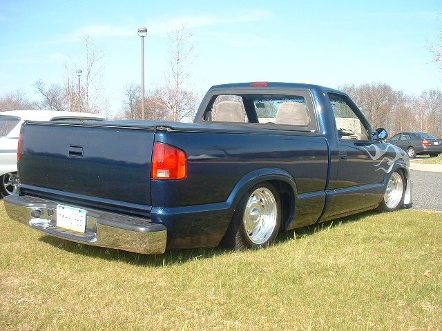 SOLD stock indigo with dupont hot hues pearl silver flames, truck covered in house of color chrome metal flake, stillen bumper cover, m3 mirrors, handles and wiper cowl painted to match.