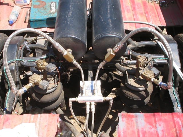 custom 4 link done by myself, custom plumbing block for the tanks, stainless steel aircraft line through the whole truck, 8 valves, 2 3 gallon tanks, 4 little compressors, bottle