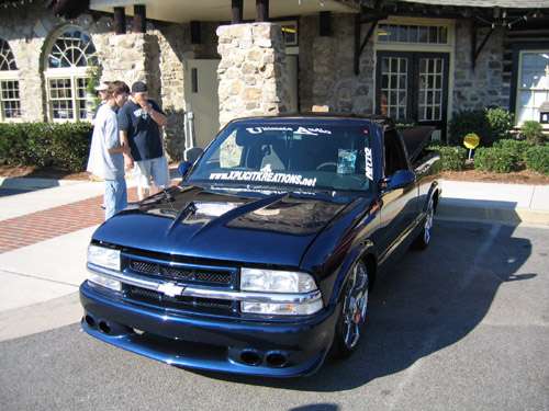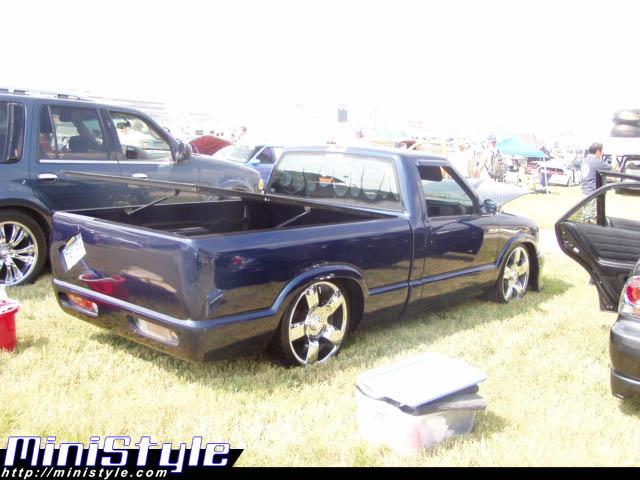 shaved door handles, and tailgate handle, sir michaels rollpan, cervinis ss hood, all painted back factory blue with pearl white gost flames full skin shaved tail lamps shaved tailgate shaved gas cap supra taillights