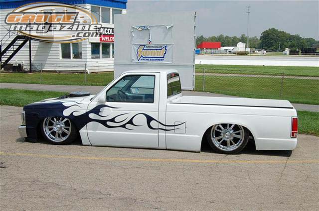 Everything shaved except taillights, 5 inch body drop, phantom billet grille, painted white with some really nasty looking flames.