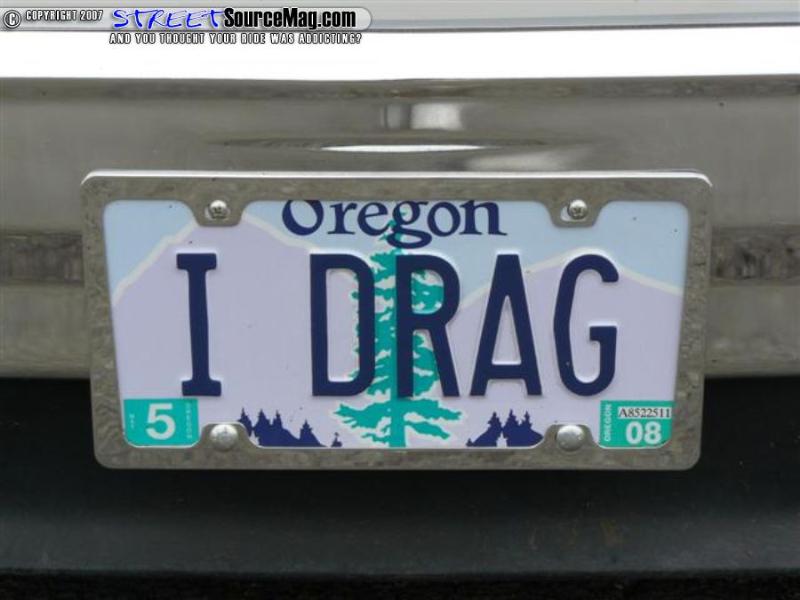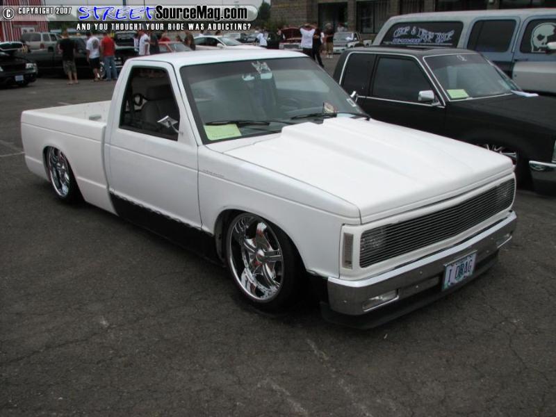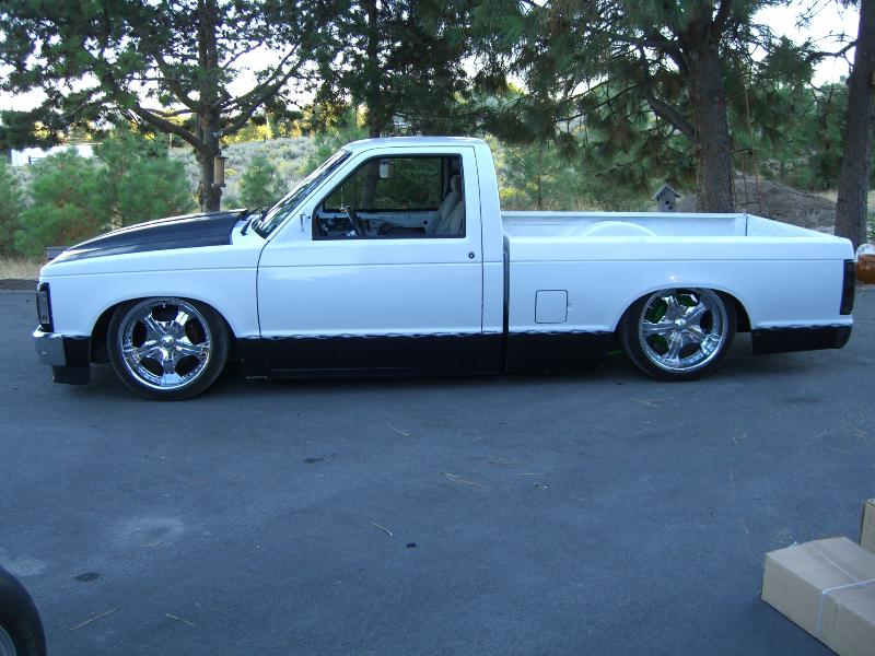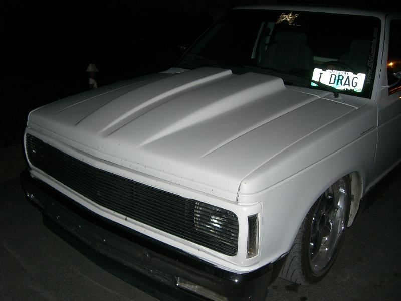 white with black rocker panels, roll pan, shaved wiper cowl, shaved door handles, shaved antenna hole, phantom grill, chrome smoothie front bumper, euro bumper and corner marker lights, cowl hood, valance, chrome diamond mirrors, custom mirror filler panels made out of bug sheet metal, shaved molding, bed cut out for c notch, cab notched for driveshaft clearance, custom flame graphics, diamond projector headlights, rear tubs, shaved squirters, shaved tailgate, shaved tail lights, 10" led strips frenched into the roll pan, tailgate handle flip kit, chrome mazda b2200 tailgate handle, billet rear license plate frame, personalize plates "I DRAG", 3" body drop, shaved firewall, suicide doors, sheet metal bed, shaved gas door, flush mount pop up gas cap