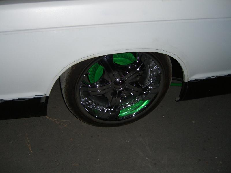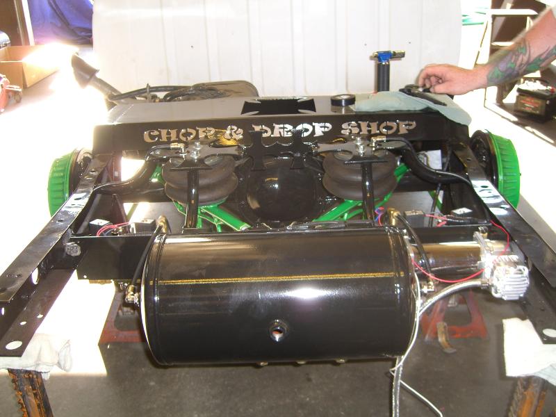 bagged on all 4 corners, reverse 4-link, 3/8" line and smc electric valves with powder coated lime green spider web link bars, 2600lb firestone bags out back and 2500lb firestone bags up front, c-notch, custom shocks, frame notched for clearance for shocks, raised gas tank crossmember, 2 viair 380c chrome compressors, 1 5 gallon tank, kept the sway bar and mounted the shocks on it, custom bridge w/ iron cross and "chop and drop shop" cut into it, 3/8" plate welded to bottom of frame, chrome brake booster with wilwood master cylinder