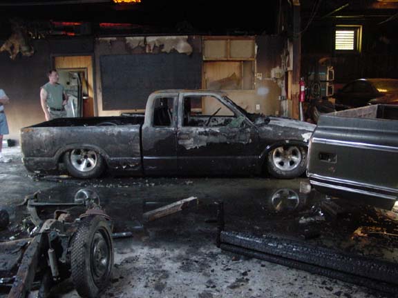 THE STORY: i had put it in the shop to get repainted for like the 3rd time and while it was there the fire department towed a grand prix to the shop my truck was at and left it outside... well, they apparently forgot to take the battery out [even though it HAD caught fire] and it sparked and caught the car back on fire right outside the shop... the wind blew the fire into the shop catching it on fire, and in turn, my truck...