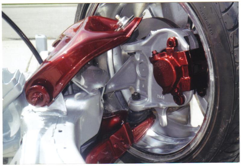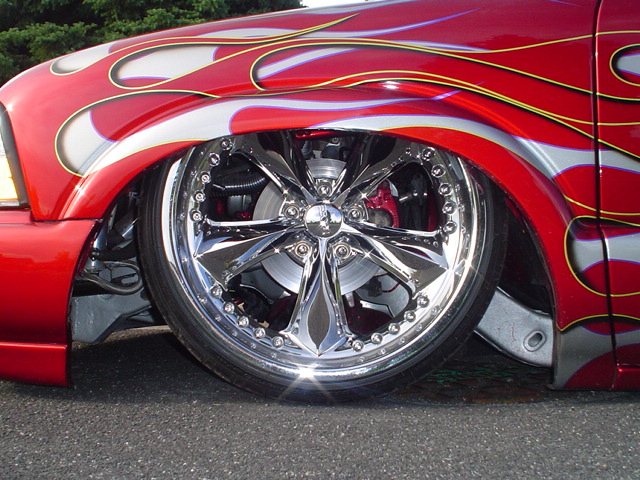 Shaved everything, Suicide doors, sheet metal bed, caddy tails, hand fabricated 2" cowl hood, 98 Sonoma front end swap R-M Carrizma Candy Apple Red paint with lots of flames.