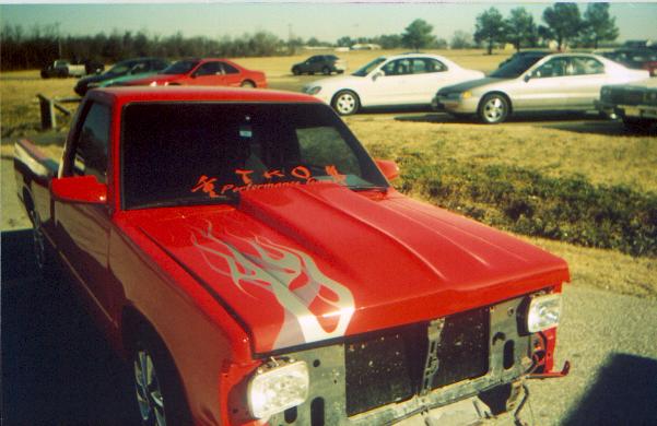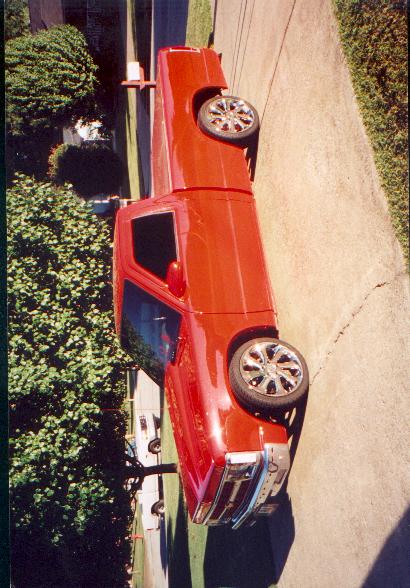 shaved door handles, tailgate handle, vents in the cowl panel,gas tank door,shaved body line in the cab and the body,roll pan welded in with the license plate box on the left side,a custom box with 95 s-10 gas tank door built in the bed for the gas tank,viper red paint from chrysler,full crome from bumper,cowl hood 2 3/4 inch, flush mount bed lid that opens to the right.