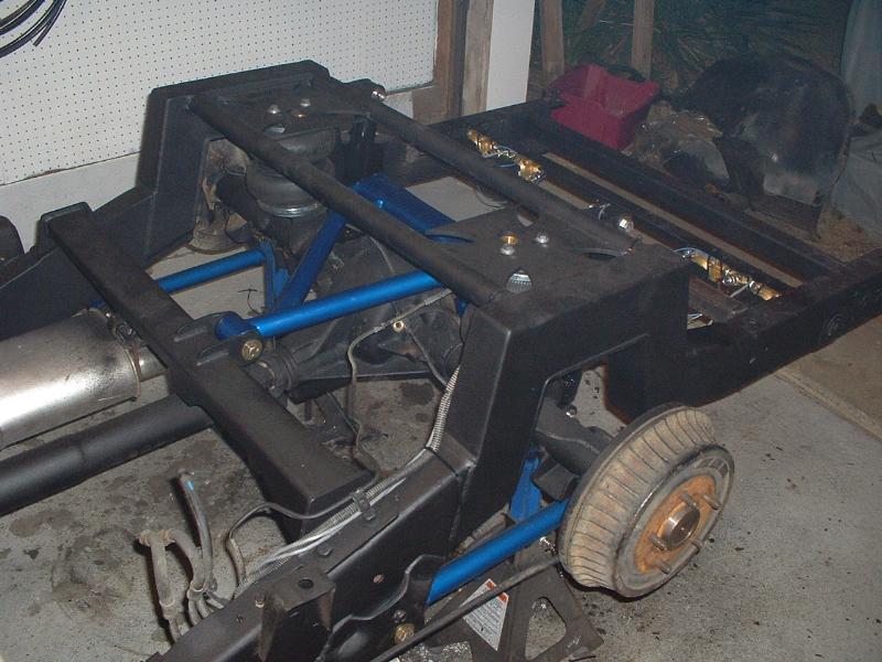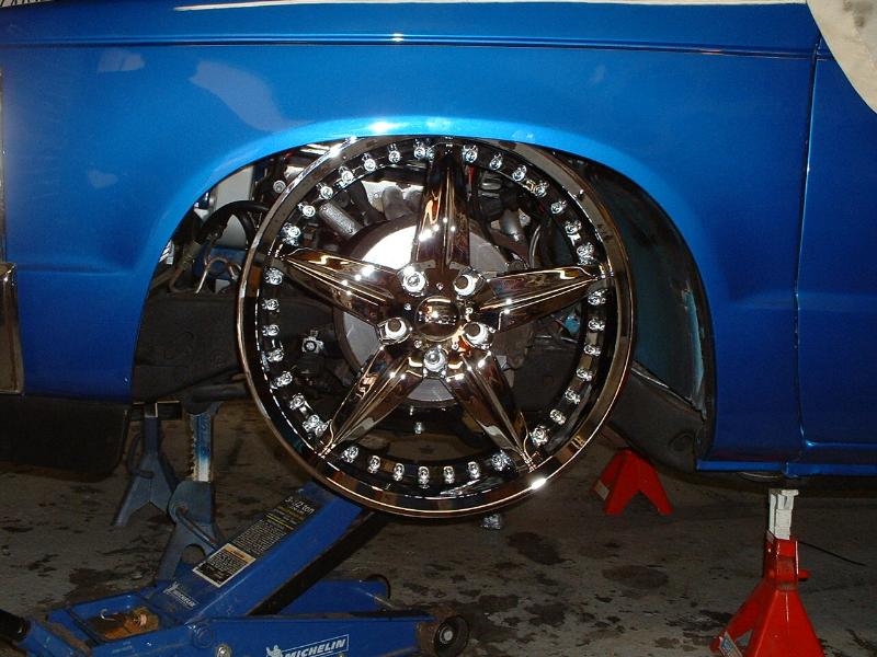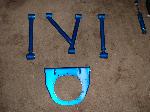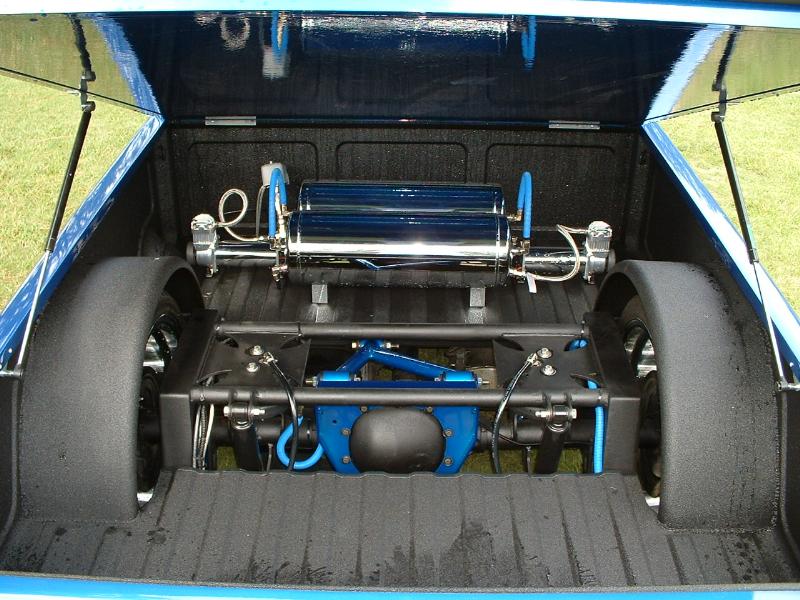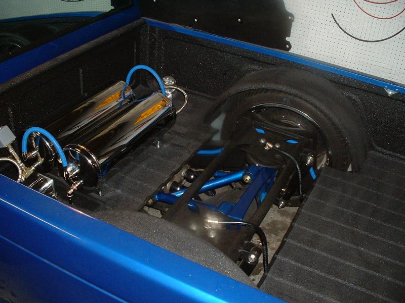 4 bags, 8 1/2 valves, 2 450 Viair Compressors, 2 chrome 5 gal tanks, # Link from SUICIDE DOORS that has been powder coated kandy blue