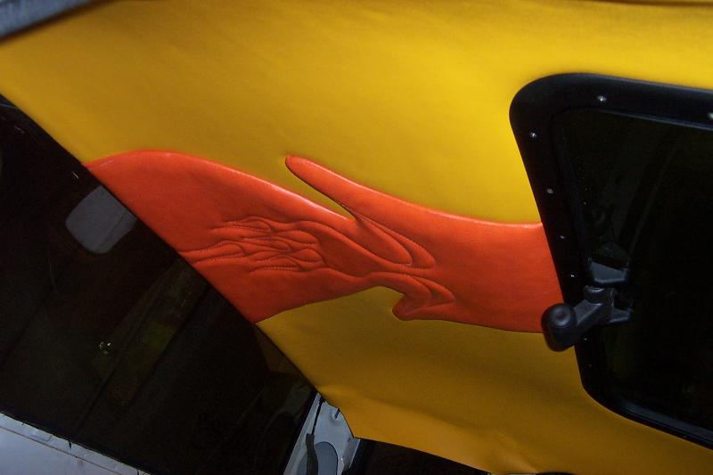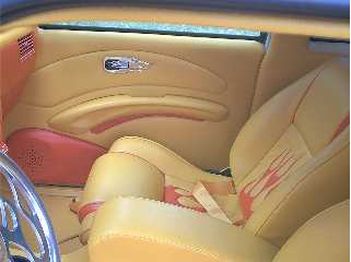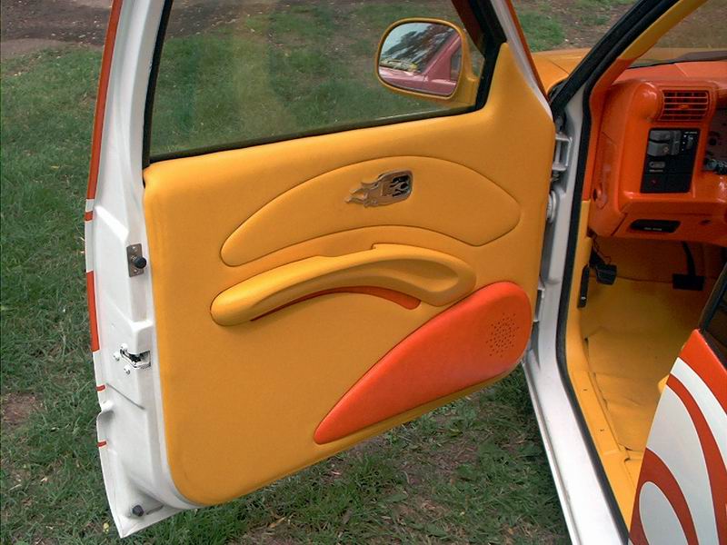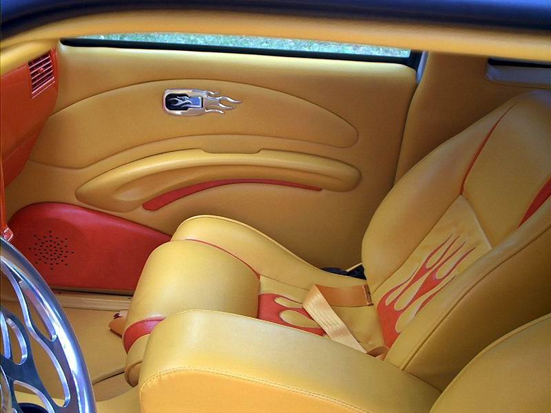 Totally custom interior,layed out in yellow and orange. FLAME MIRROR FLAME HANDLES
