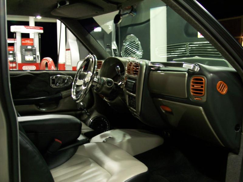 Grey tweed on door panels, headliner, a pillars, back wall trim, kick panels, sill plate. Flamed gauges, BAD Mauler full billet wheel. Full line of S10 interior sponsorship from KAIK Products..billet door and dash speakers..defrost billet insert...door handle bezels billet..also window cranks from KAIK products!!! Everything plastic on interior removed and completely sanded smooth and painted to match exterior..
