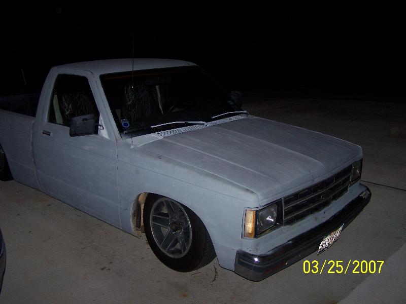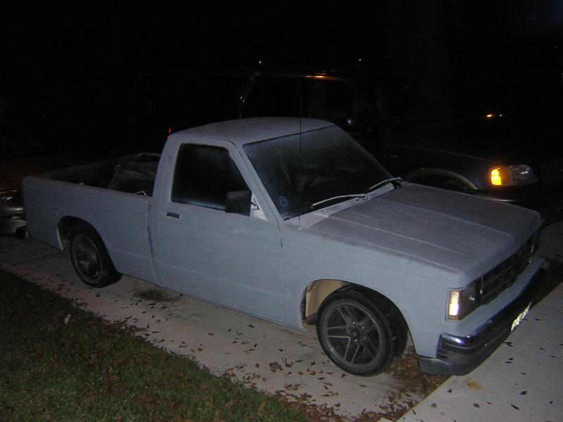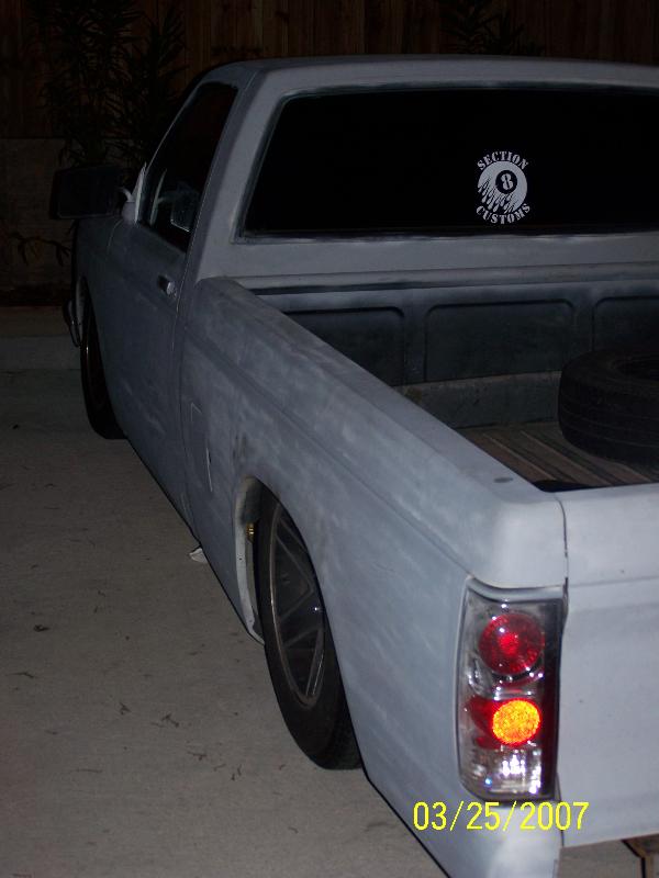 Hot rod paint job, 18 inch centerlines smoothies, 3.5 inch bodydrop, shave the door handles and weld the tailgate shut, Leds, fiberglass center console with one ten in the back and some kind of interior