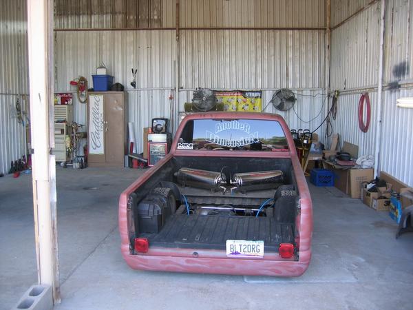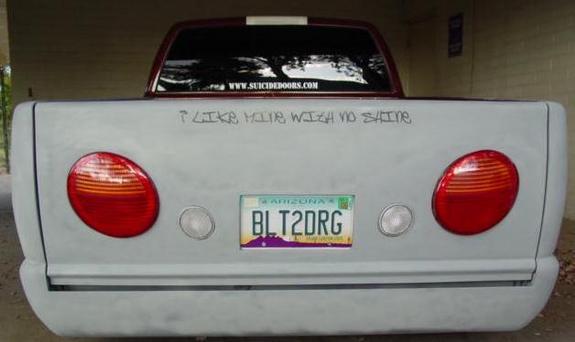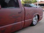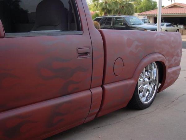 Rockin flamed Primer, 98+ front end, MIC Fast Flames, TYC clear headlights and turn signals, Billet bowtie, relocated tailgate handle, Molded Steel FBI rollpan, shaved tails, 99 VW beetle lights, shaved 3rd brake light, Shaved Antenna & shaved bed seams.