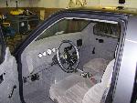 Fiberglassed dash with autometer gauges, head unit, LCD screen and DVD player. 99 S10 bucket seats, fiberglassed subwoofer box molded to back wall of cab.