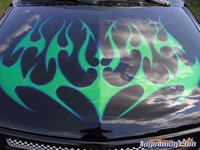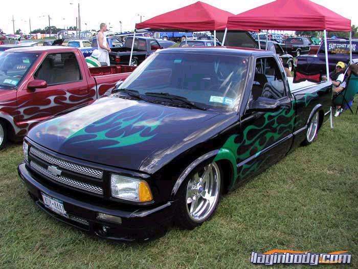 frenched front plate blazer grille speed grilles street scene mirrors flush bed cover shaved gate,handels,squirters,antenna,led third brake light, roll pan,lime time green tribal flames w/ blue slash stripes
