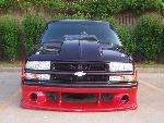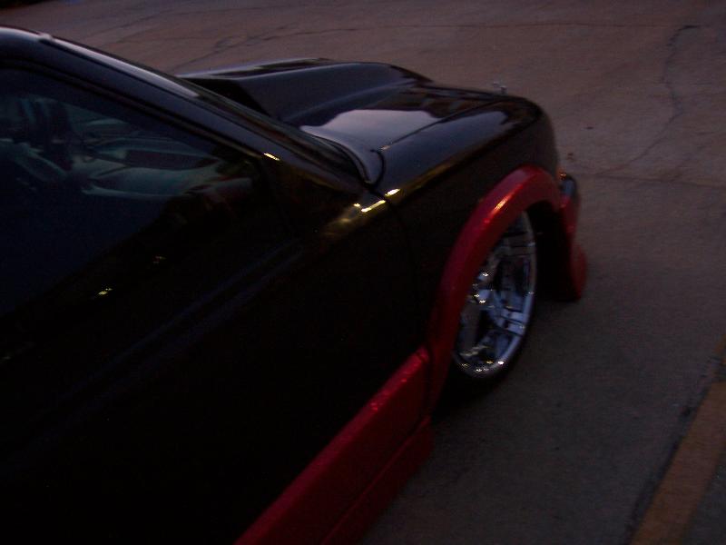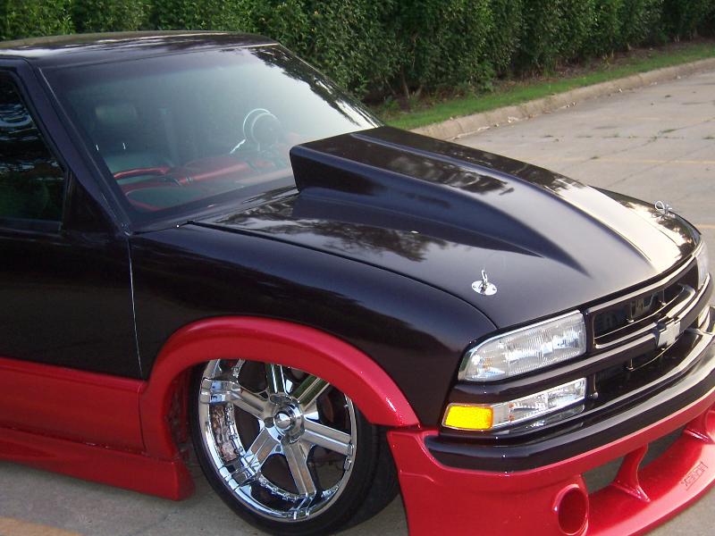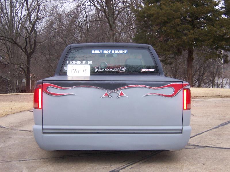 shaved mirors, door handles, squirters, fuel door, third brake light, antenna, tail gate handle, FBI rollpan, Zenon front bumper cover, UP22 4 3/4 cowl hood, smooth cowl, checker bed cover, PPG black lava red pearl on top, PPG flame red on the bottom with 6oz. of flame red Old School Flake*SOLD