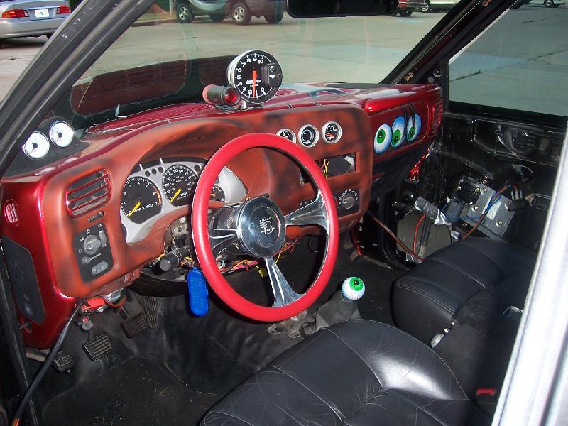 half way stripped, leather power seats from a Cirrus, Billet "Rail" steering wheel, smoothed and painted dash, fiberglassed door panels-shaved with 10" subs.*SOLD
