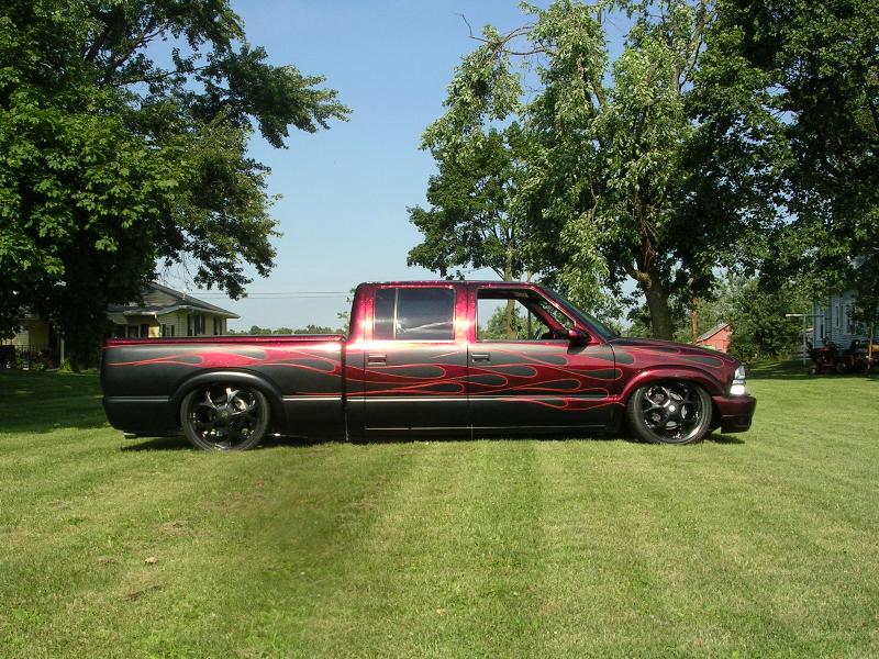 smoothedtailgate and taillights custom painted flat black with kandy red flames flaked out and pin striped in orange