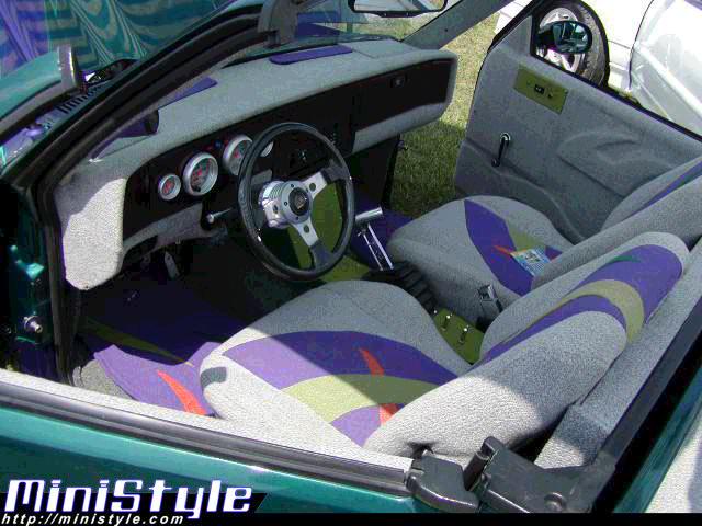 Tweed everything, five colors in seats to match outside graphics, autometer gauges, carbon fiber steering wheel, etc.