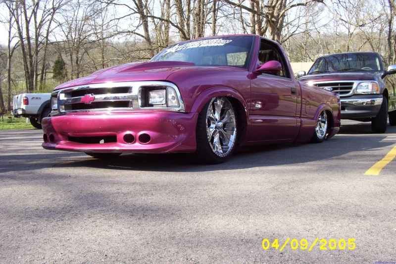Rasberry Metallic paint, Goodmark Cowl Hood, Street Scene Gen 2 Bumpercover/air dam, Rear Roll Pan, Street Scene Mirrors, 98+ S10 conversion with diamond headlights and signals, all chrome grill