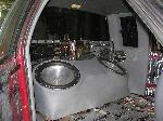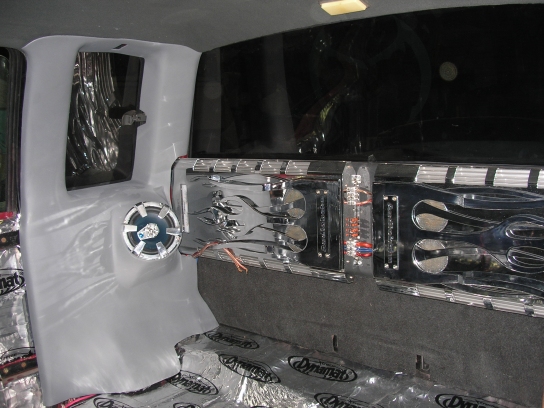 2 Audiobahn Alumapro 15" subwoofers run by 2 a2300hct amps. 4800wt's total, enclosed in a sealed fiberglass box. Mids consist of four 3 way audiobahn 5 1/2 speakers run by a 400wt audobahn a4002T amp. And a Clarion headunit