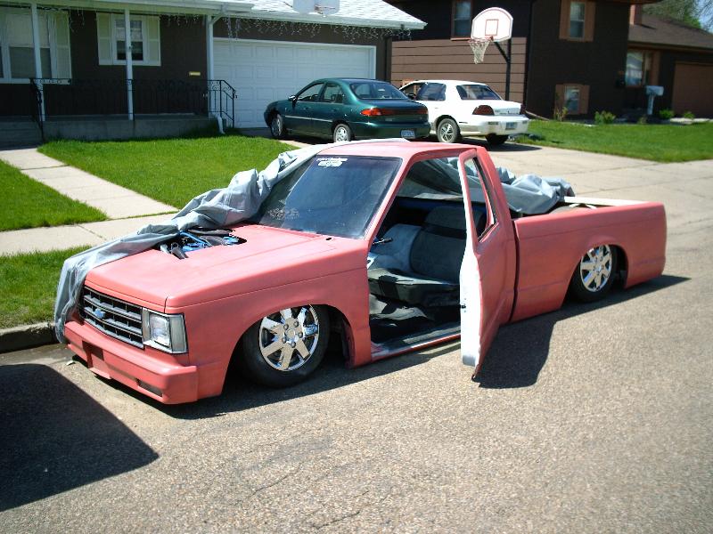 pink primer, shaved, bodydropped 4 1/2, suicide doors, tubbed with matching bed lines notch cover, crooked front plate in bumper