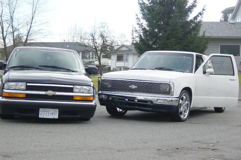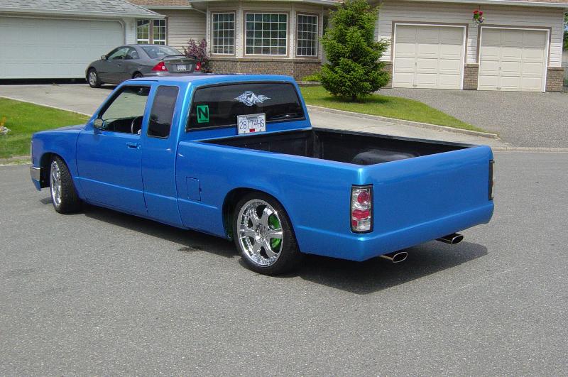 white primer...shaved body line,wipper cowl ducts,cab seems,gas cap, tailgate- dump truck bed lift up- cutlass mirrors,roll pan,frame painted gabber green,phantom grille, 92 toyota bumper with clear corner lights, euro tail lights, window tint,